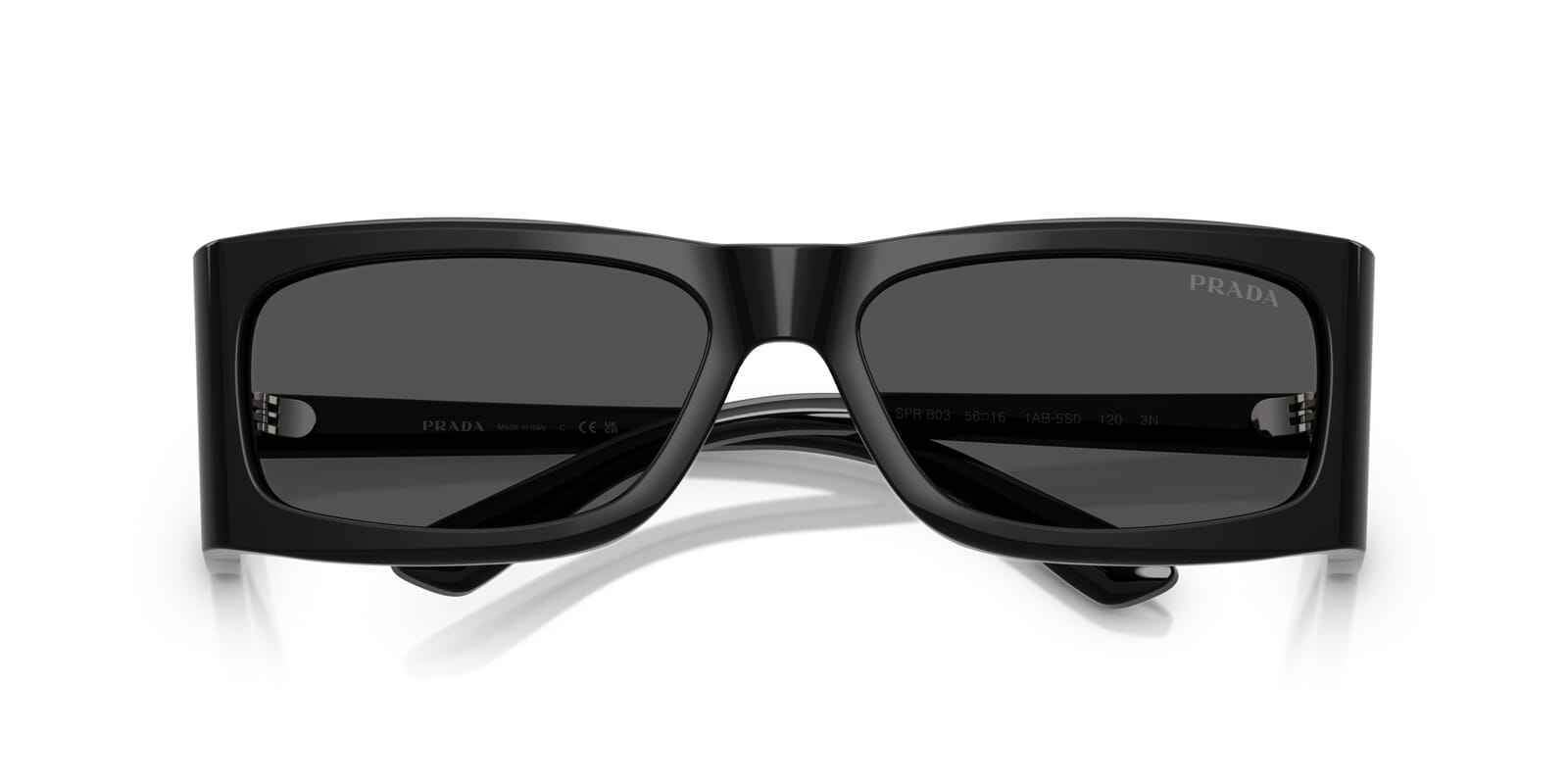 This rectangular Prada sunglass comes in a black frame with dark grey lenses.