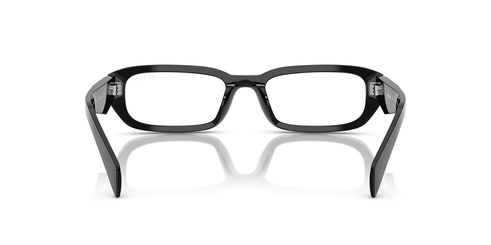 This rectangular Prada sunglass comes in a black frame with clear blue violet light filter lenses.