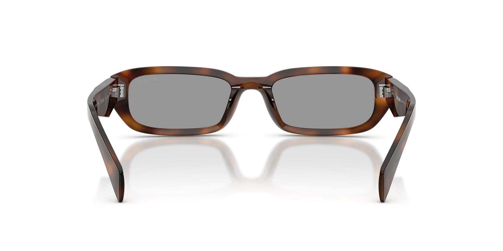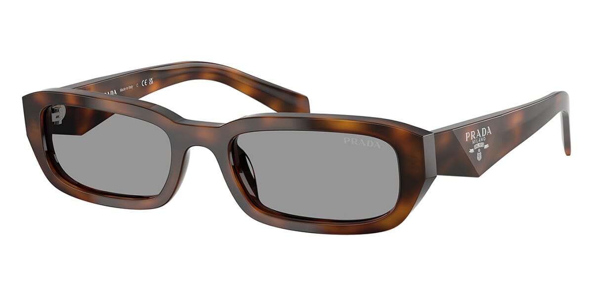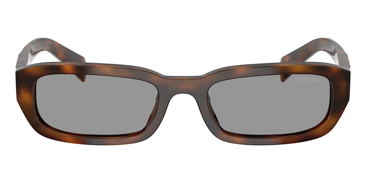 This rectangular Prada sunglass comes in a juniper tortoise frame with grey lenses.