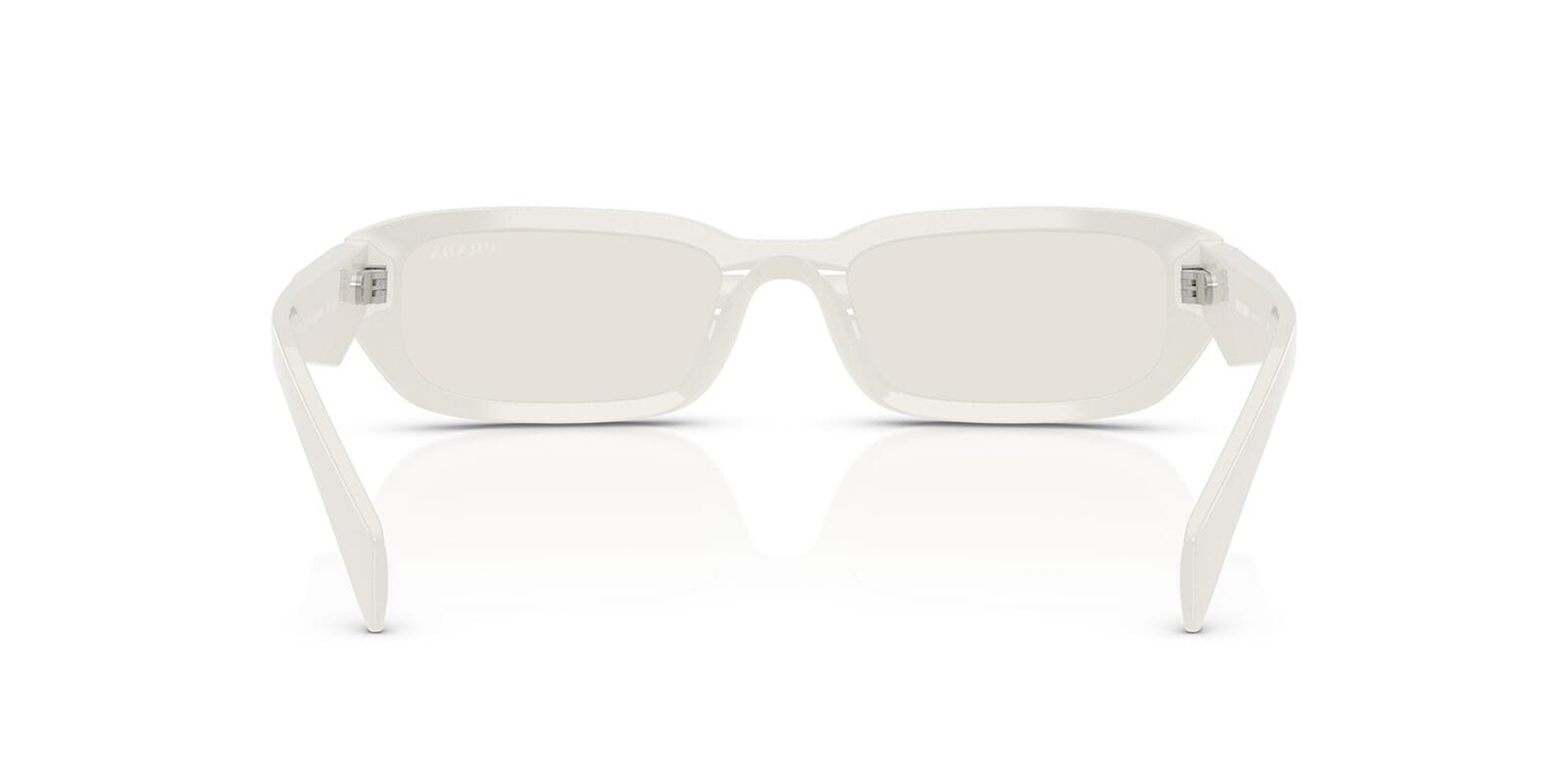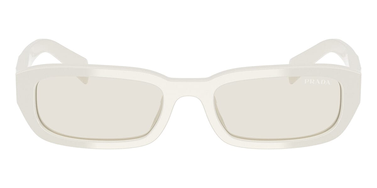 This rectangular Prada sunglass comes in a dust frame with light grey lenses.
