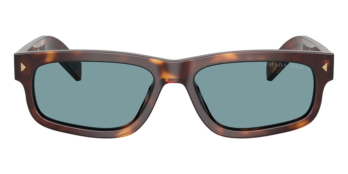 This rectangular Prada sunglass comes in a classic tortoise frame with green polarised lenses.