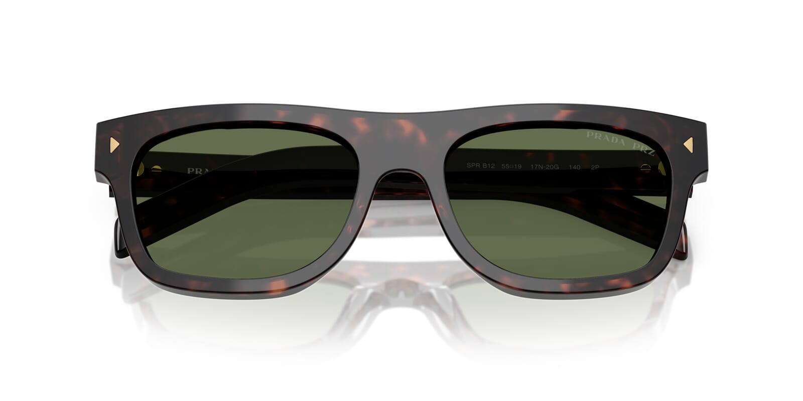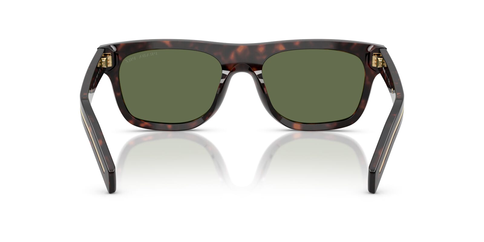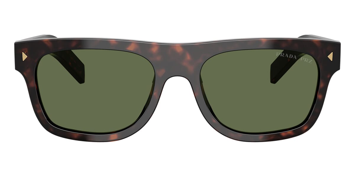 This rectangular Prada sunglass comes in a root tortoise frame with green polarised lenses.