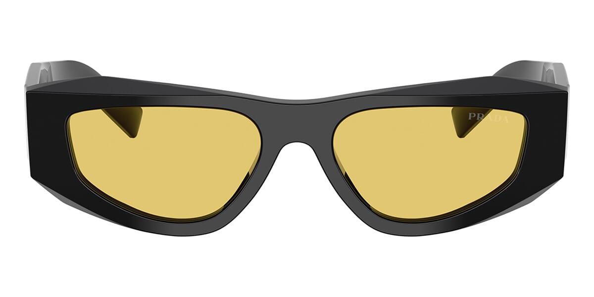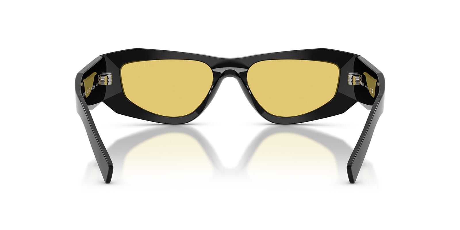 This rectangular Prada sunglass comes in a black frame with yellow lenses.