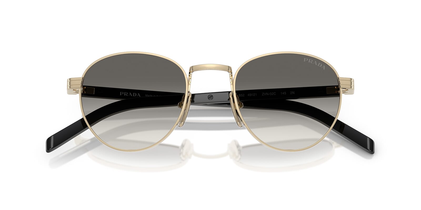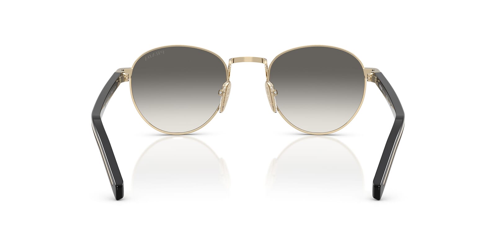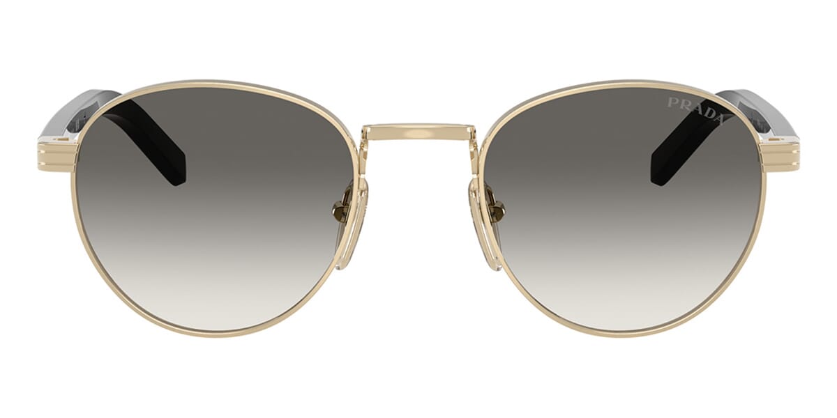 This round Prada sunglass comes in a pale gold frame with grey gradient lenses.