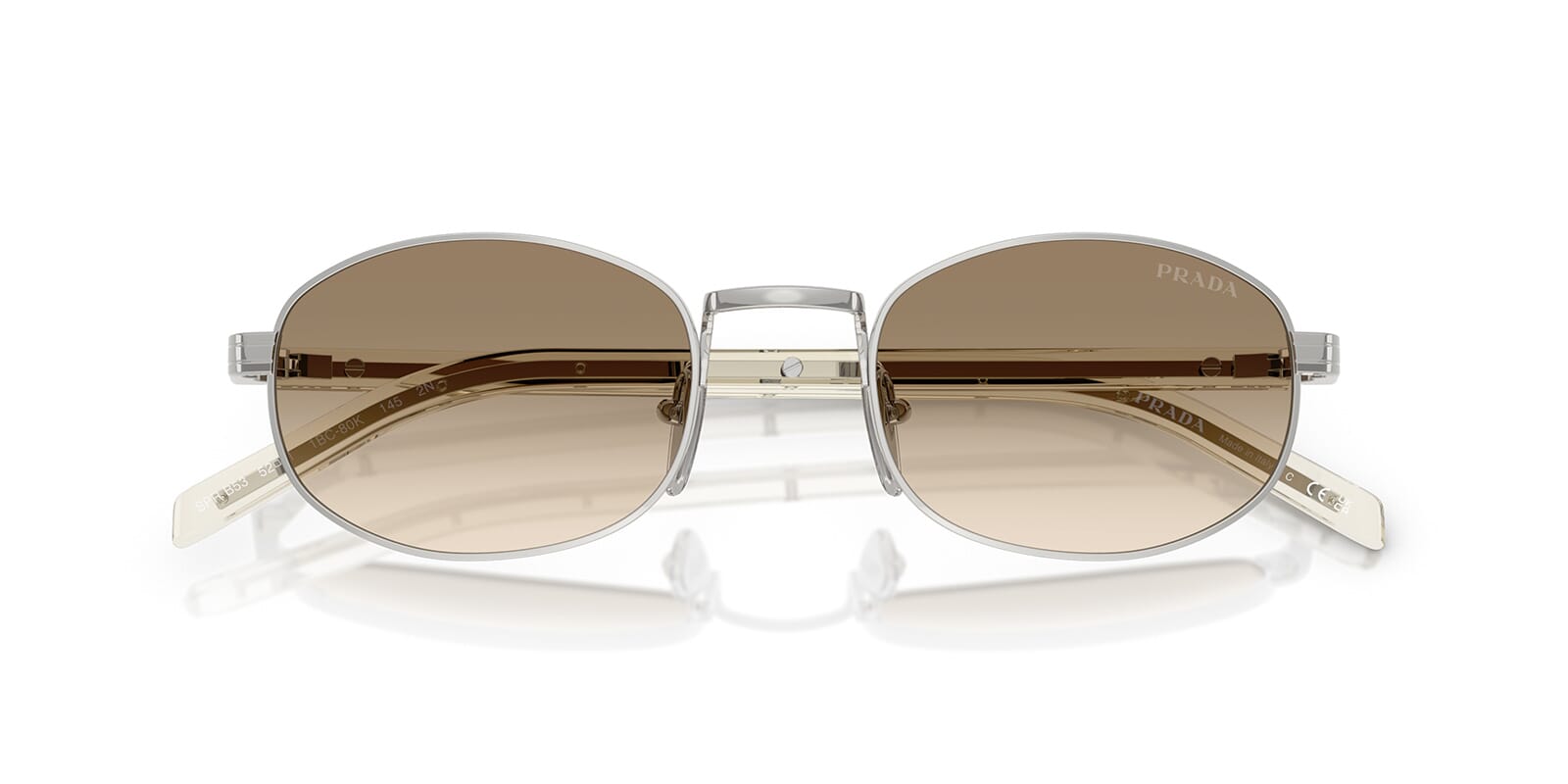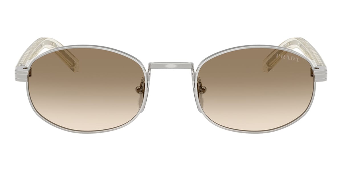 This round Prada sunglass comes in a silver frame with brown to light yellow gradient lenses.