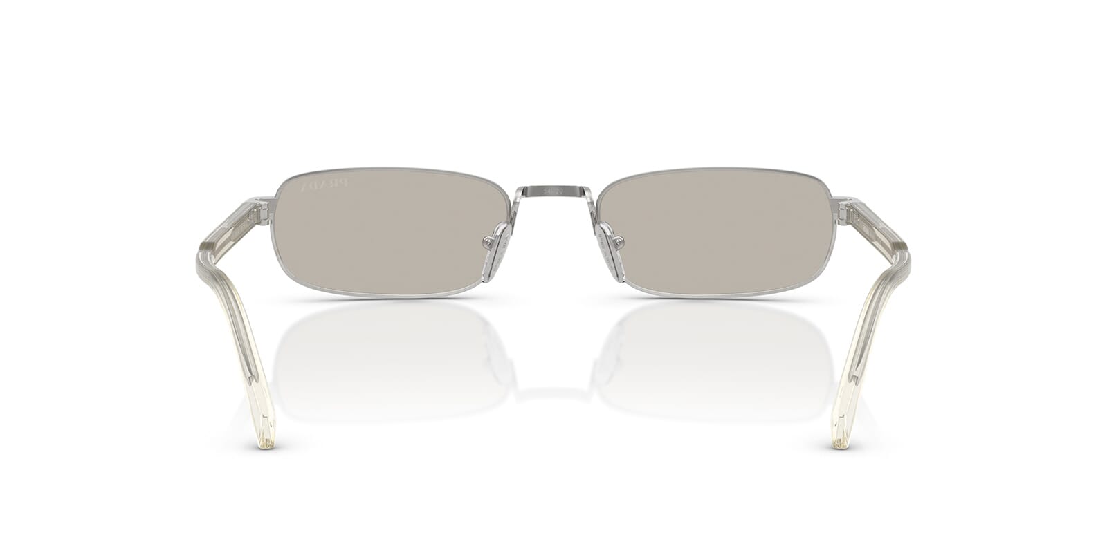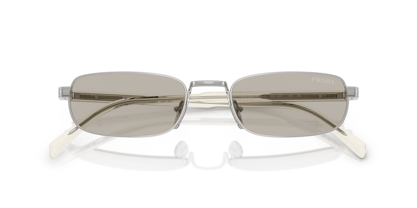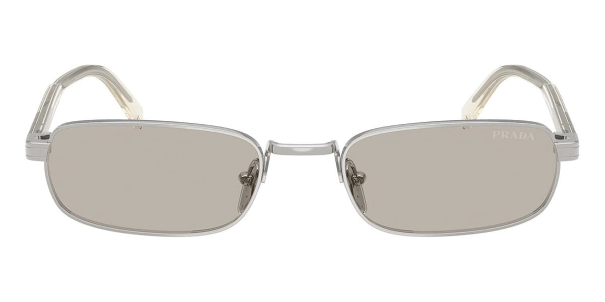This rectangular Prada sunglass comes in a silver frame with light brown lenses.