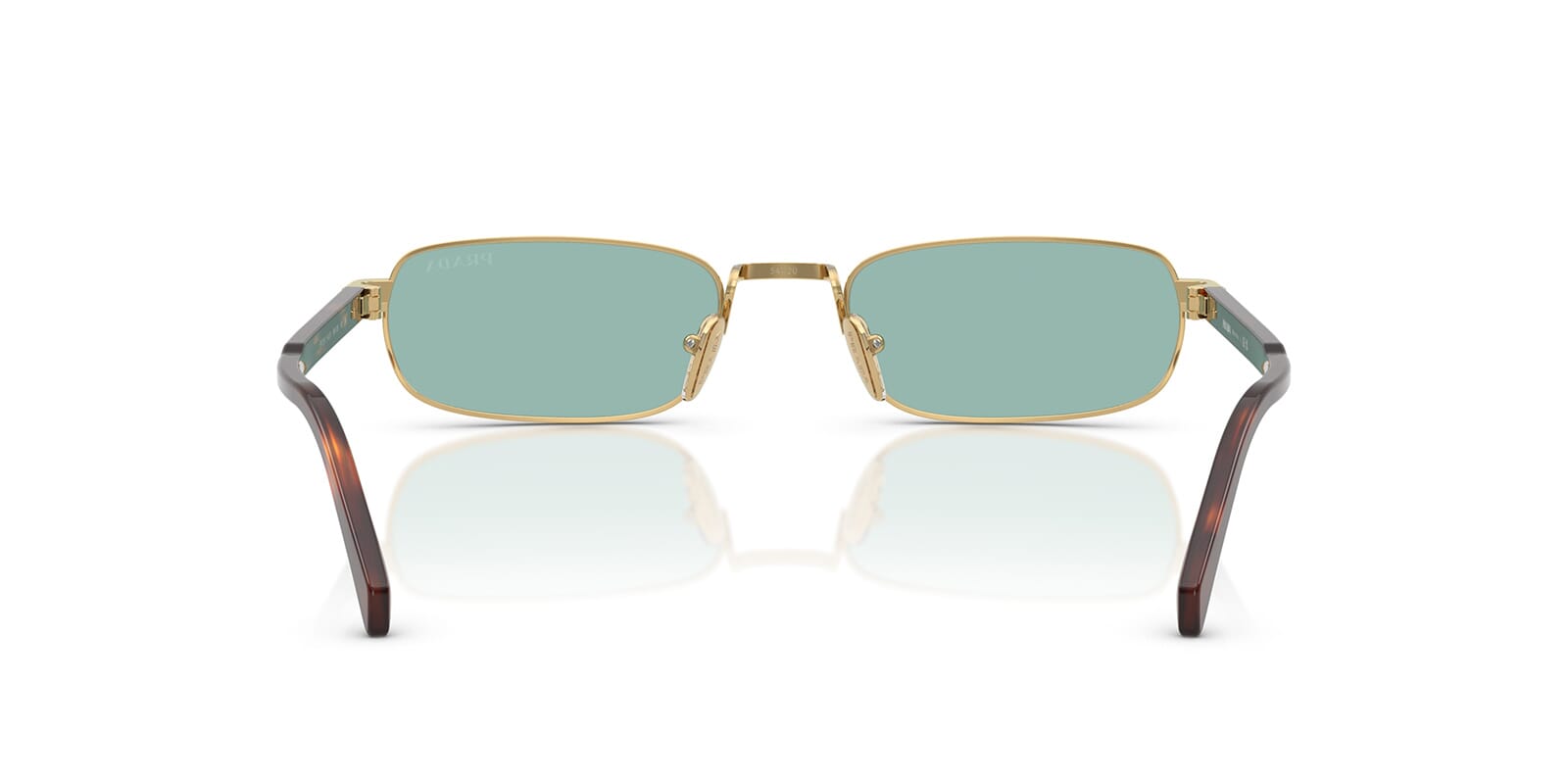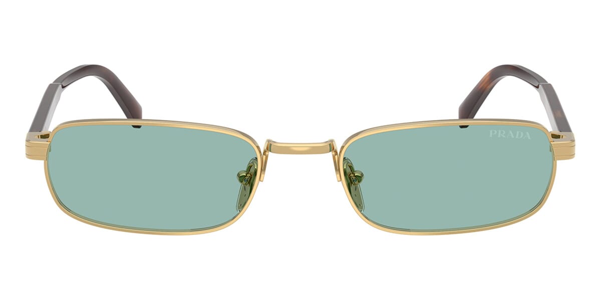 This rectangular Prada sunglass comes in a gold frame with petrol green lenses.