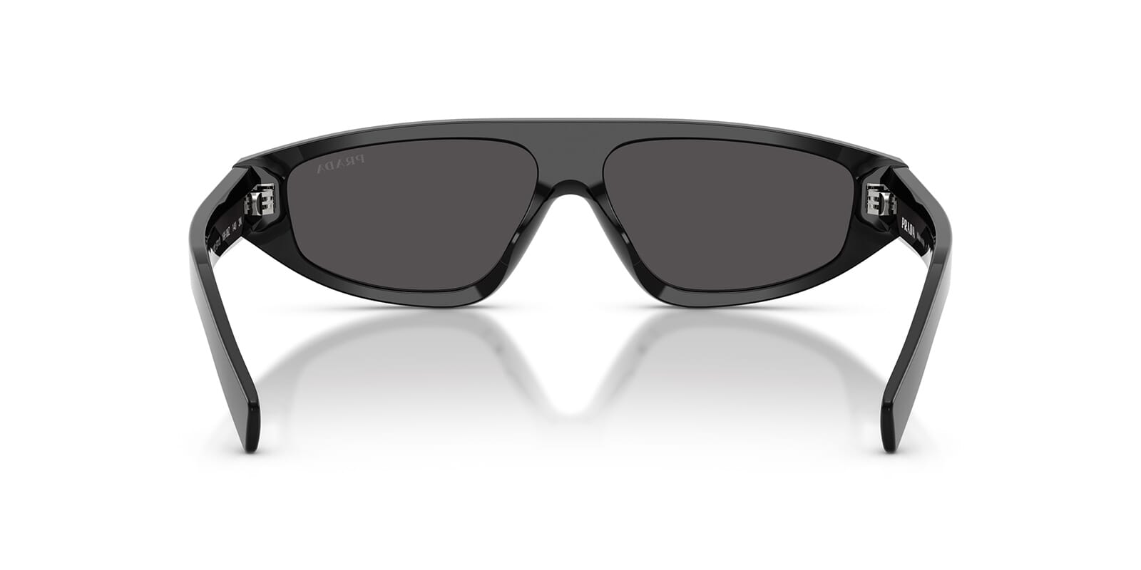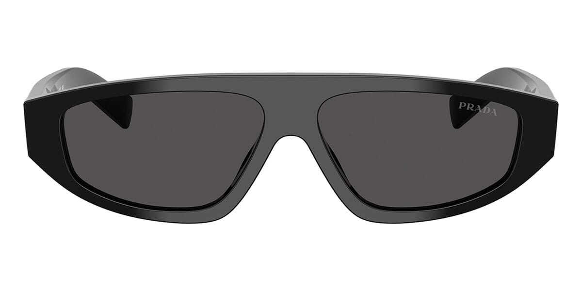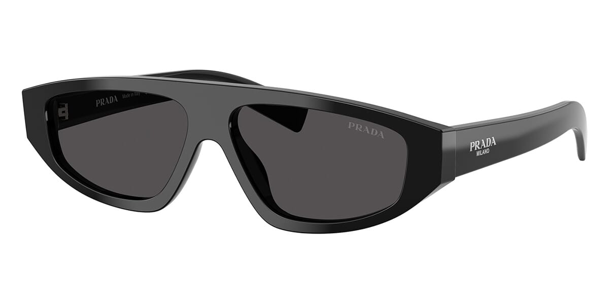 This rectangular Prada sunglass comes in a black frame with dark grey lenses.