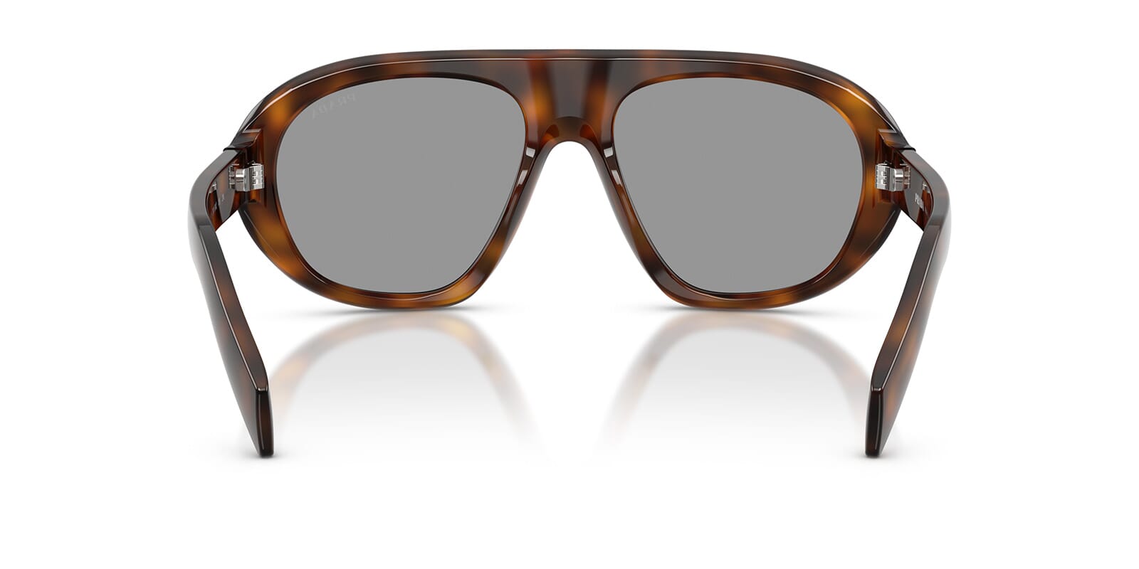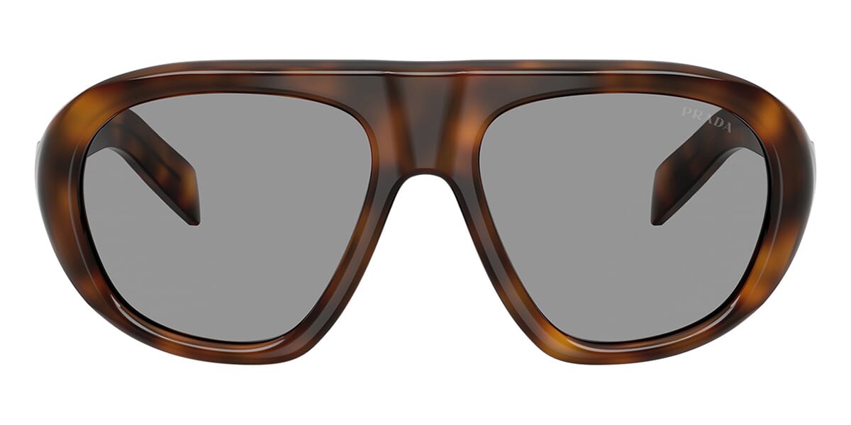 This aviator Prada sunglass comes in a juniper tortoise frame with grey lenses.