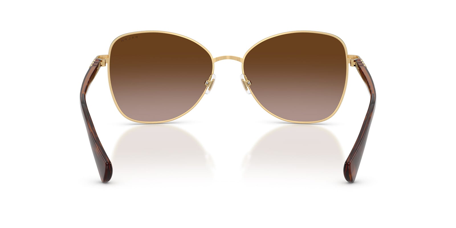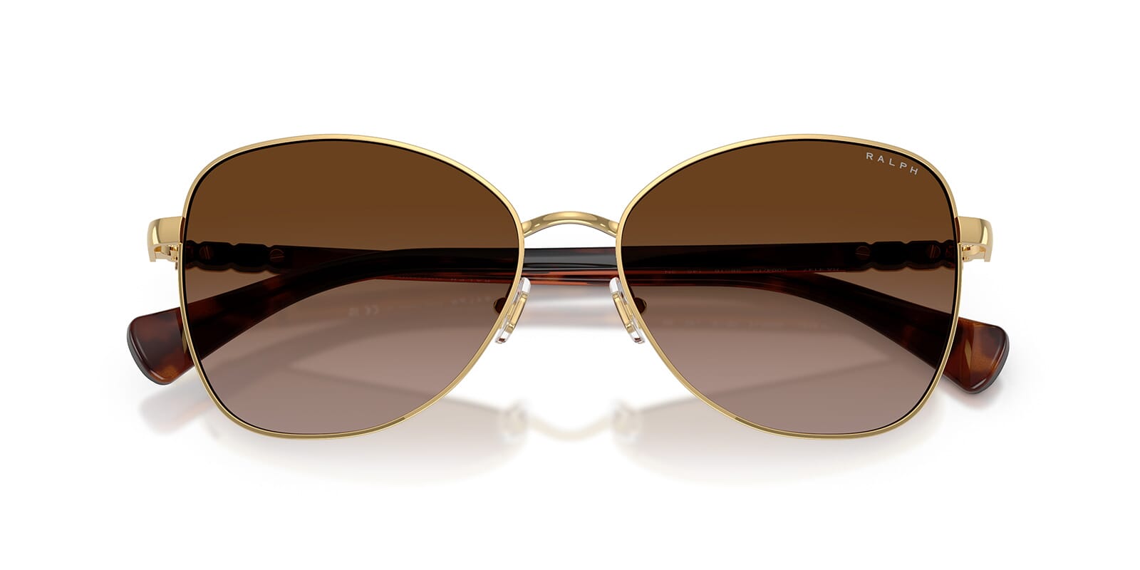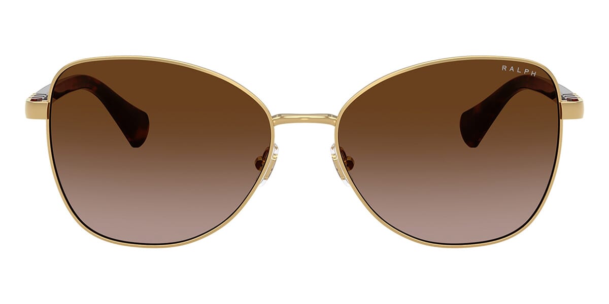 This butterfly Ralph by Ralph Lauren sunglass comes in a shiny gold frame with brown gradient lenses.