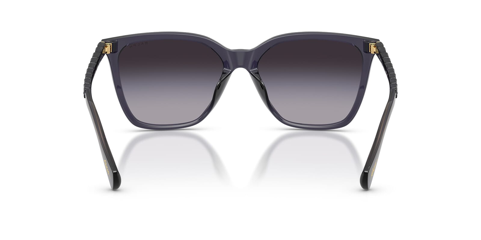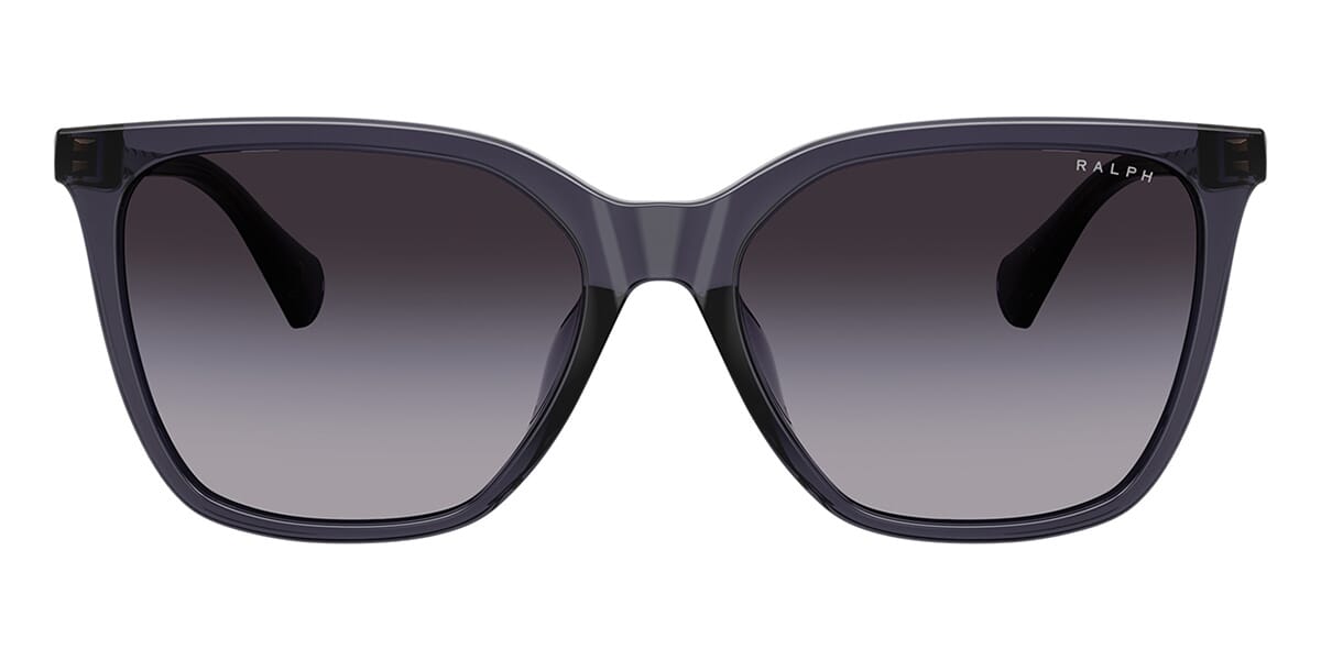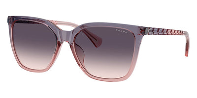 This square Ralph by Ralph Lauren sunglass comes in a shiny violet crystal frame with grey violet gradient lenses.