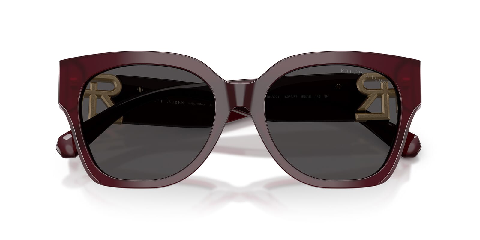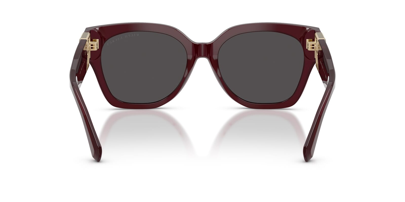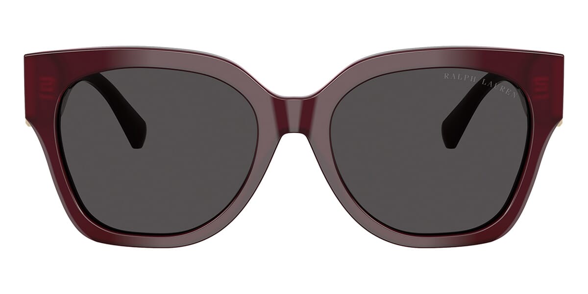 This butterfly Ralph Lauren sunglass comes in a solid bordeaux frame with dark grey lenses.