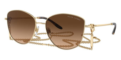 This round Ralph Lauren sunglass comes in a gold frame with grey gradient lenses.
