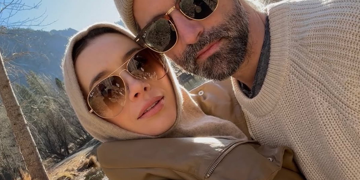 Canadian actress Emmanuelle Chriqui, pictured with partner Sam Trammell, was seen wearing gold Ray-Ban Aviator 3025 001/51 Gold/Light Brown Gradient sunglasses in her Instagram post