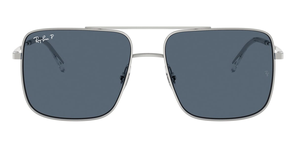 This square Ray-Ban sunglass comes in a silver frame with blue polarised lenses.