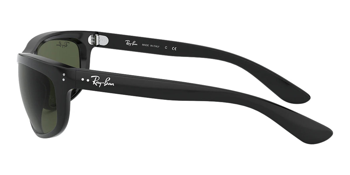 This wraparound Ray-Ban sunglass comes in a shiny black frame with green with light mirror lenses.