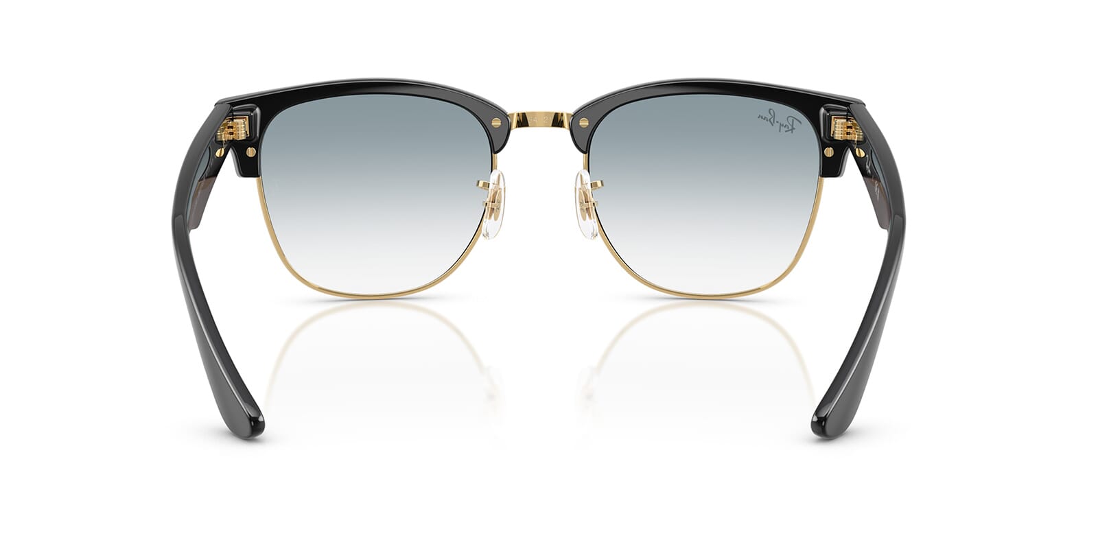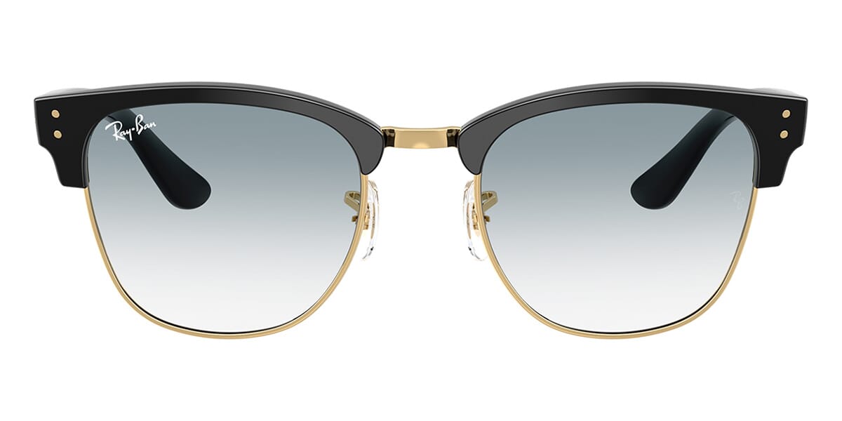 This square Ray-Ban sunglass comes in a black on gold frame with blue to clear gradient lenses.