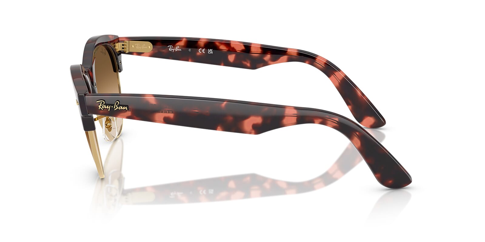 This round Ray-Ban sunglass comes in a pink tortoise on gold frame with clear brown gradient lenses.