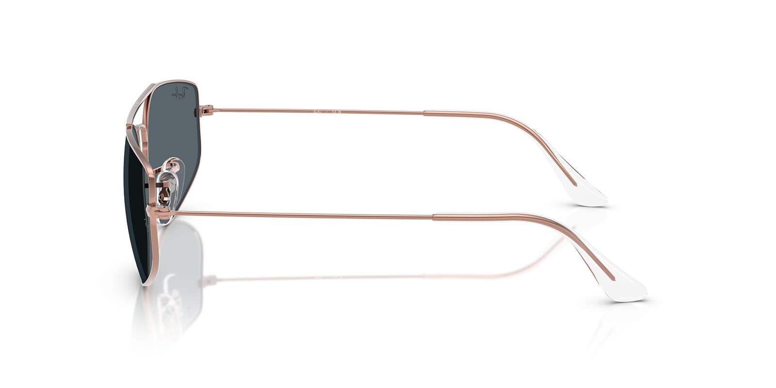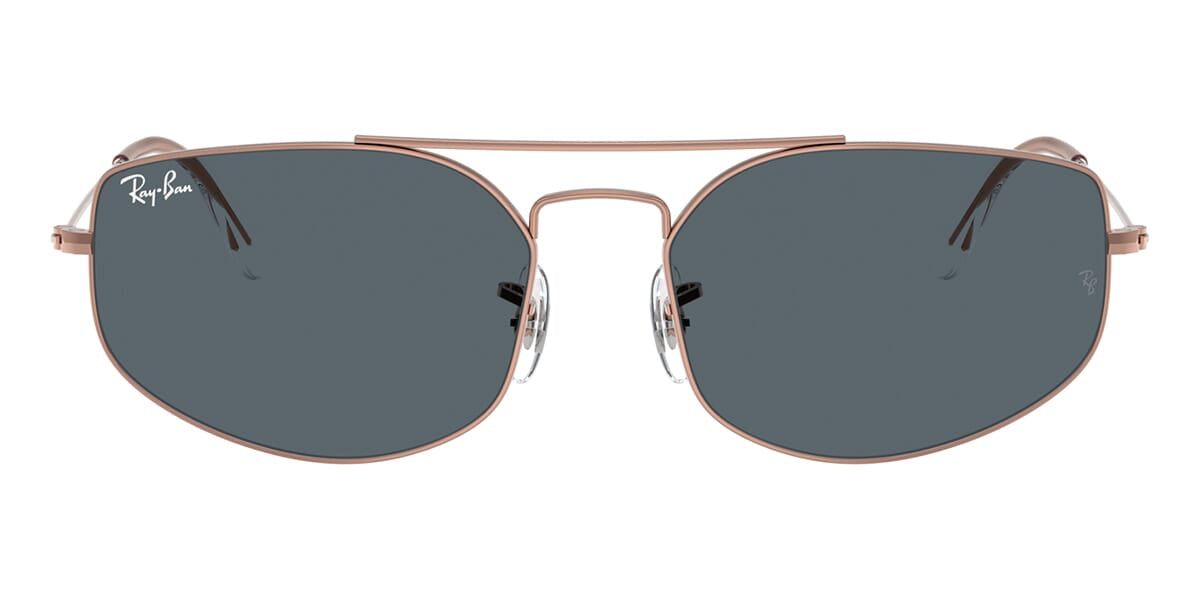 This rectangular Ray-Ban sunglass comes in a copper frame with blue lenses.
