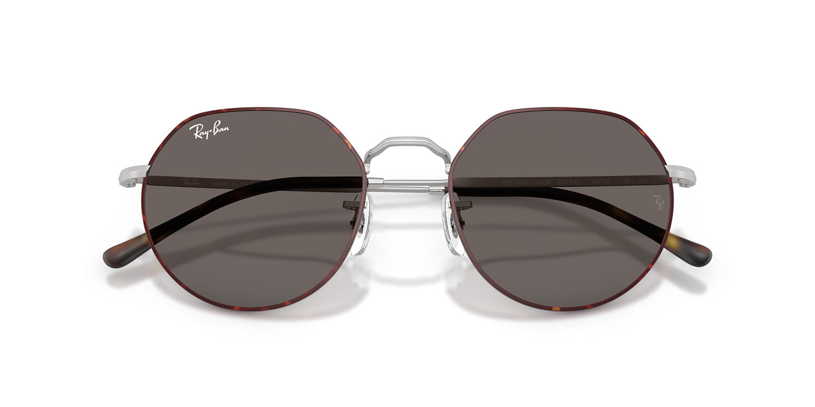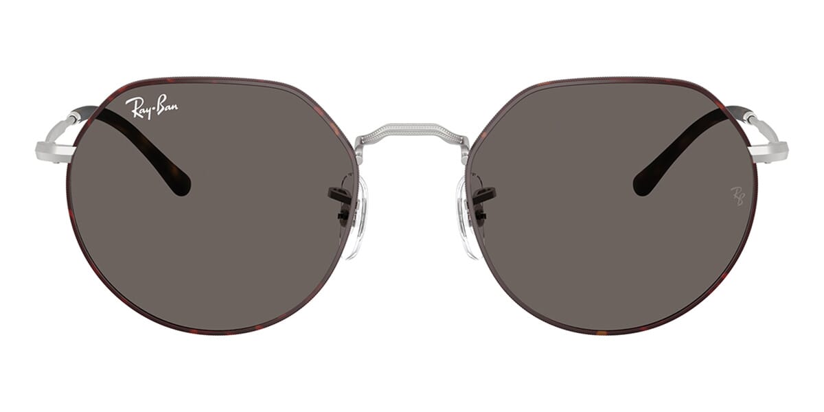 This round Ray-Ban sunglass comes in a matte havana on matte silver frame with dark grey lenses.