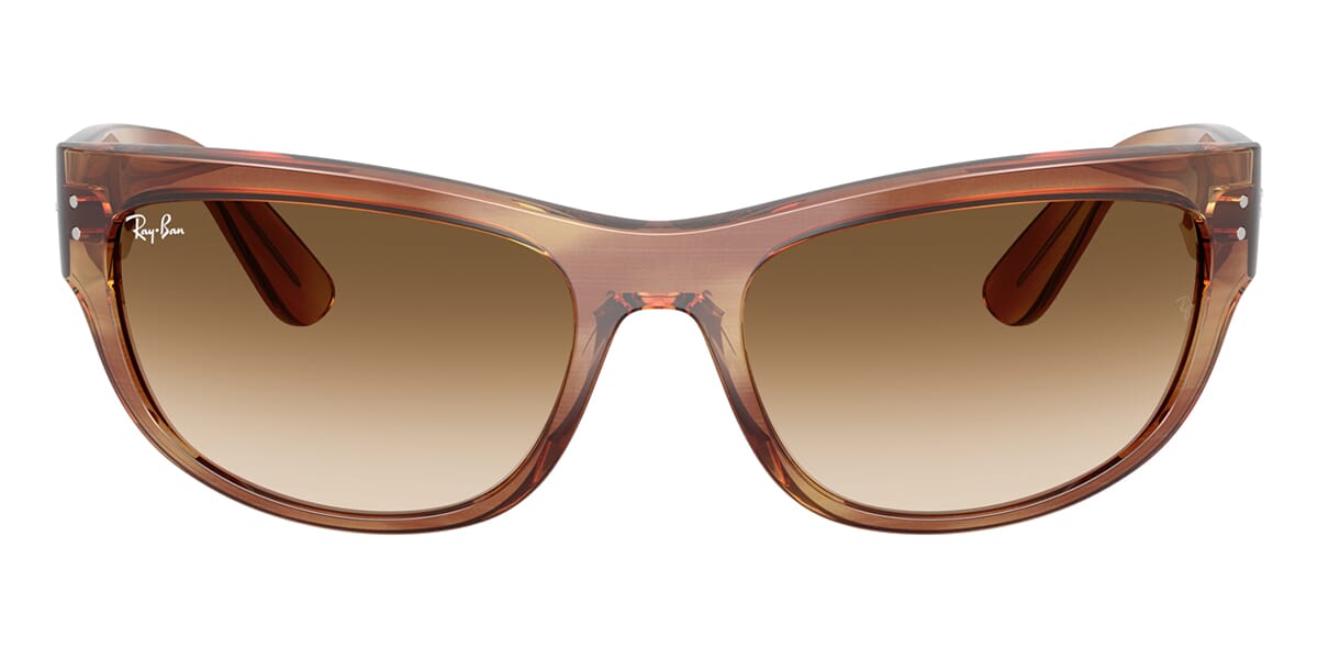 This rectangular Ray-Ban sunglass comes in a striped brown frame with brown to clear gradient lenses.