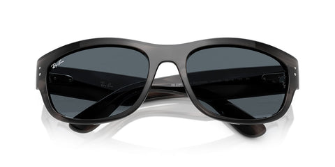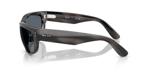 This rectangular Ray-Ban sunglass comes in a striped gray frame with blue lenses.
