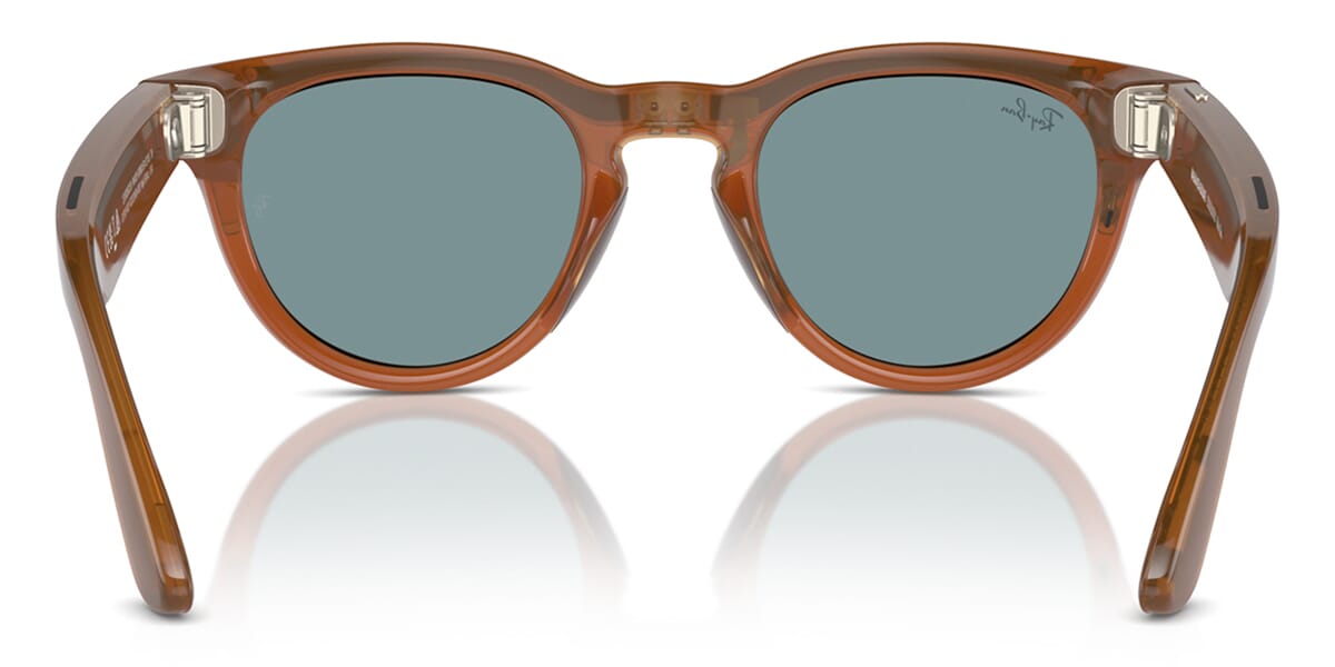 This round Ray-Ban sunglass comes in a caramel frame with teal blue lenses.