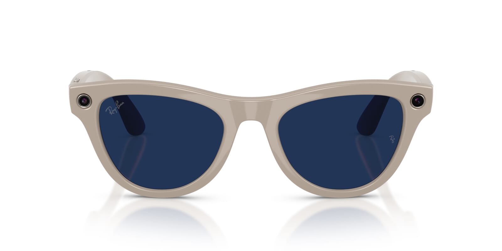 This cat eye Ray-Ban sunglass comes in a shiny chalky grey frame with clear to sapphire blue photochromic transitions lenses.