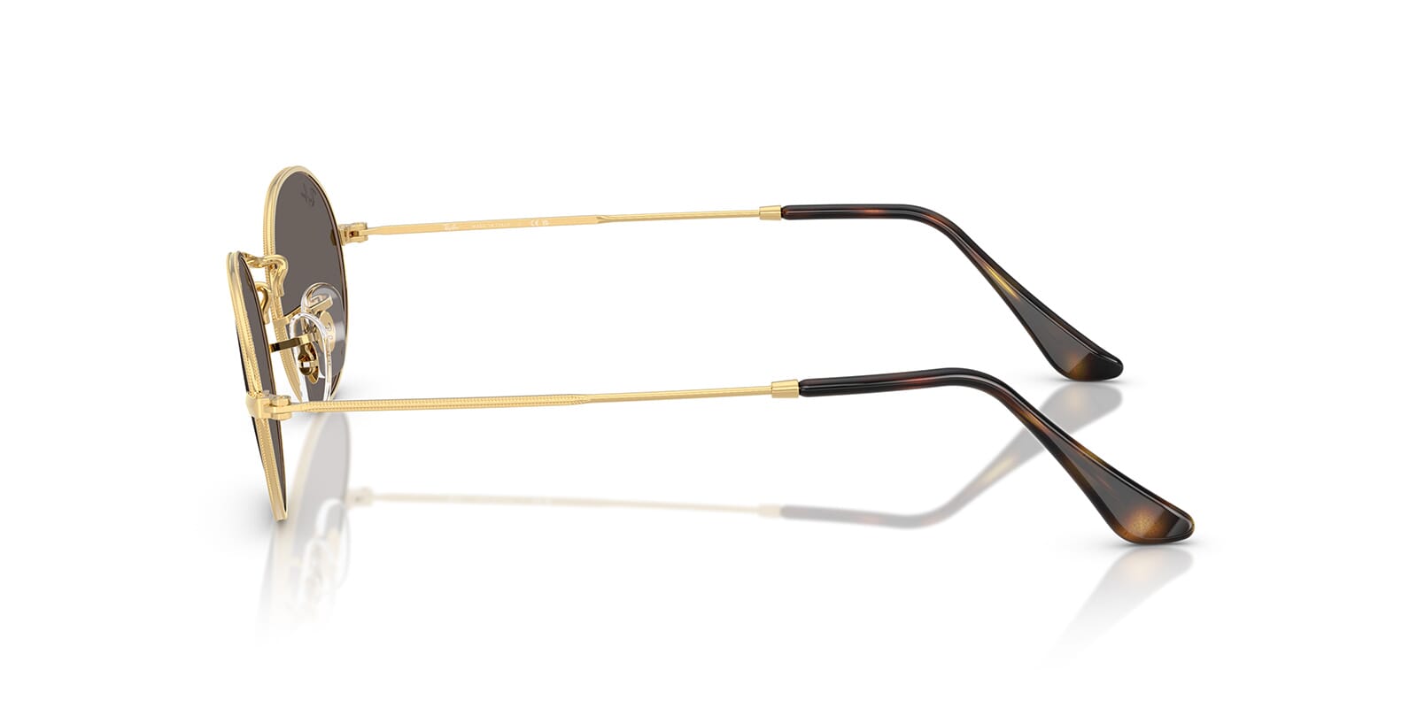 This round Ray-Ban sunglass comes in a arista gold frame with dark grey lenses.