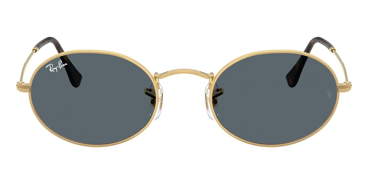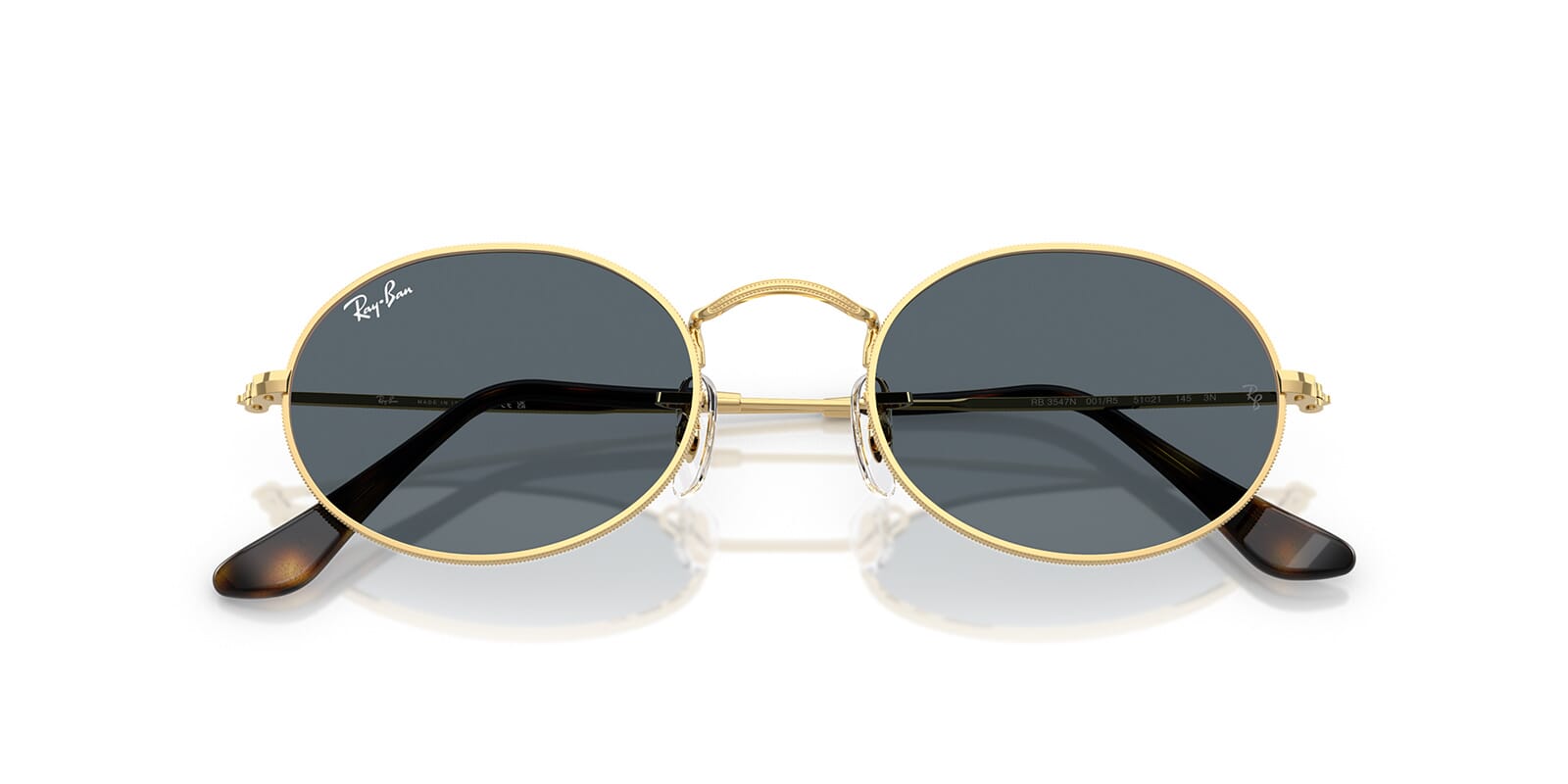 This round Ray-Ban sunglass comes in a arista gold frame with blue lenses.