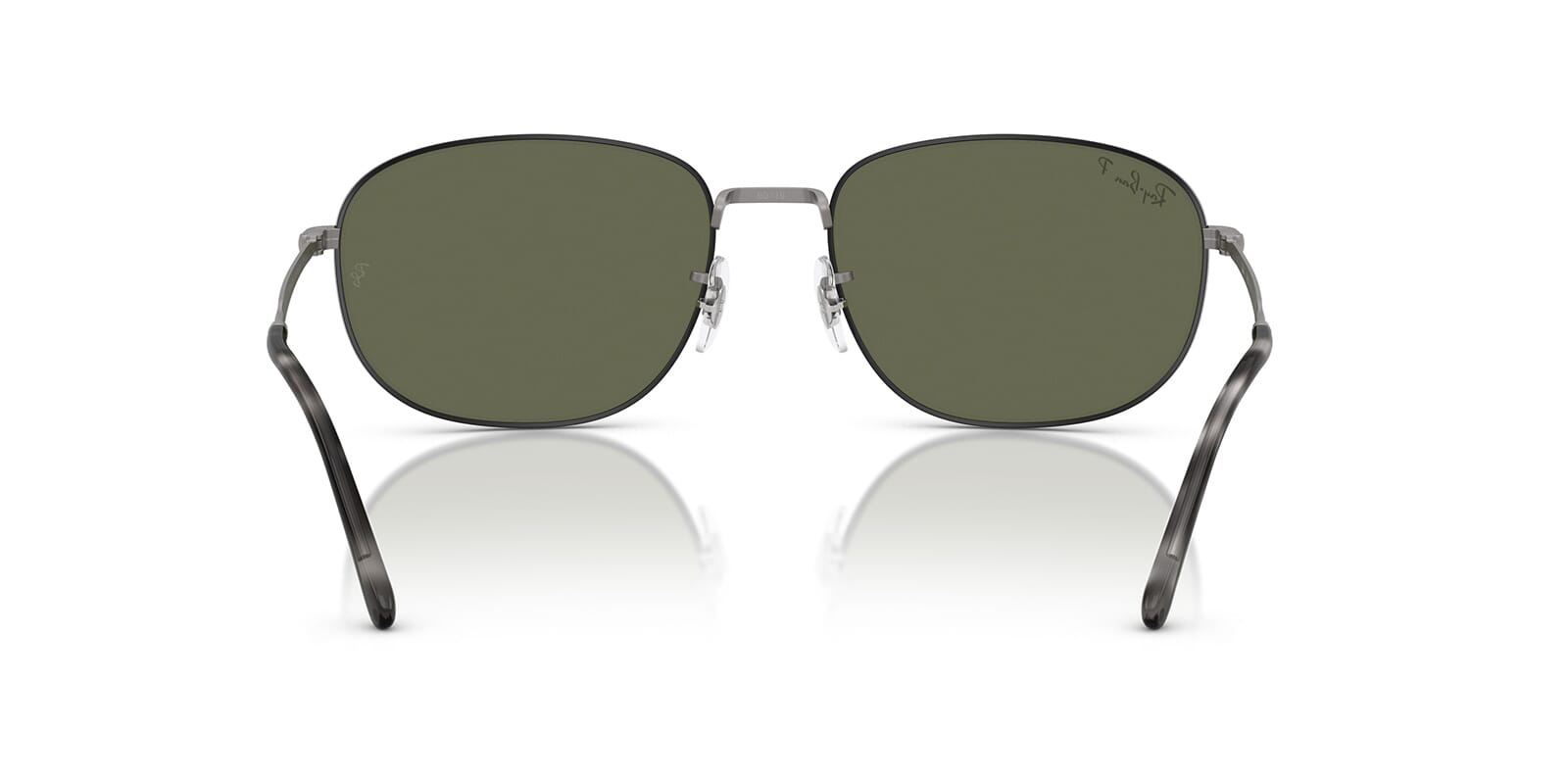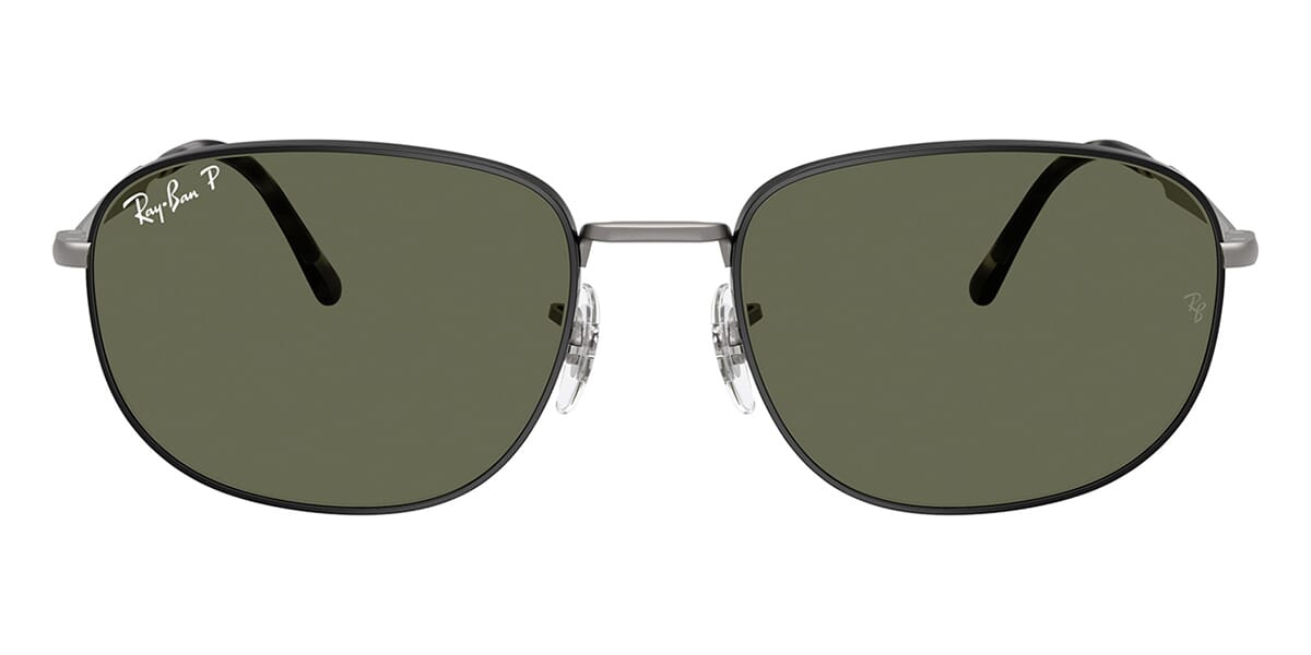 This square Ray-Ban sunglass comes in a matte black on matte gunmetal frame with green polarised lenses.