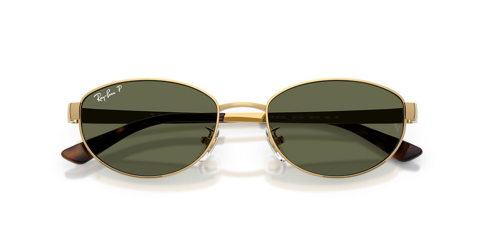 This round Ray-Ban sunglass comes in a arista gold frame with dark green polarised lenses.