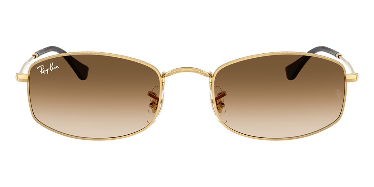 This rectangular Ray-Ban sunglass comes in a arista gold frame with brown to clear gradient lenses.