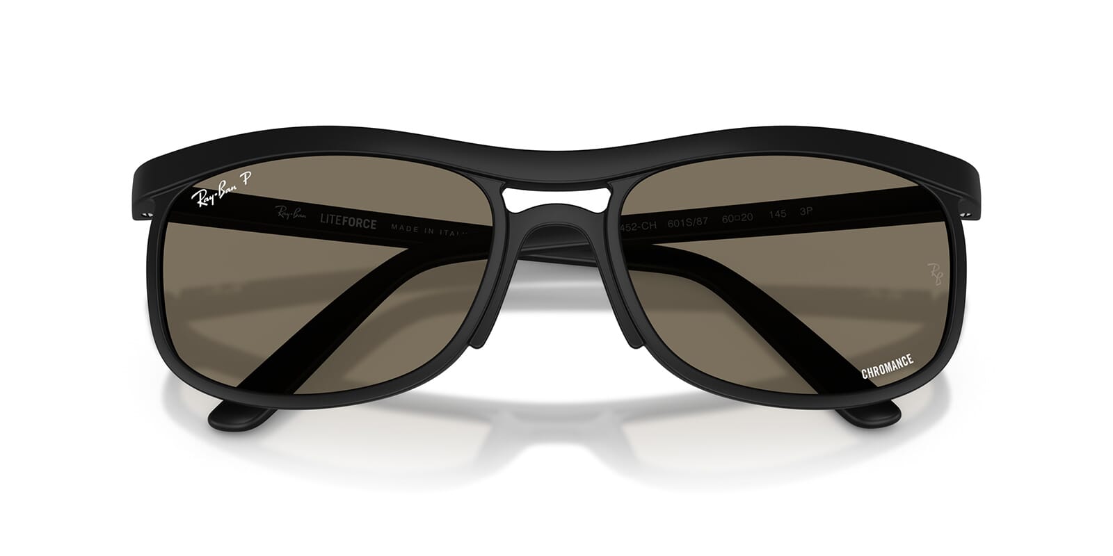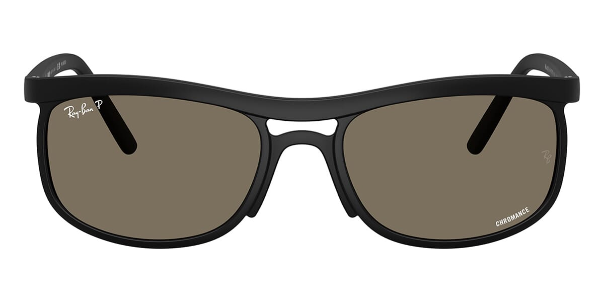This square Ray-Ban sunglass comes in a sand black frame with grey chromance lenses.