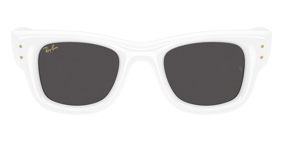 This square Ray-Ban sunglass comes in a white frame with ultra black lenses.
