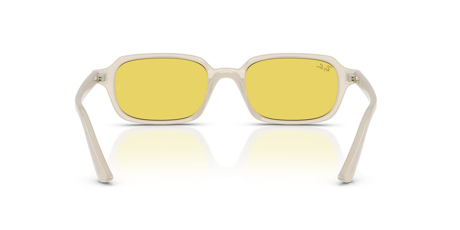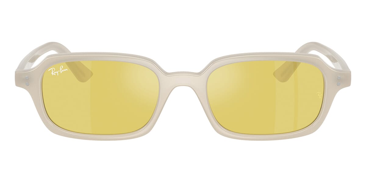 This rectangular Ray-Ban sunglass comes in a cloudy warm white frame with yellow with gold flash mirror lenses.