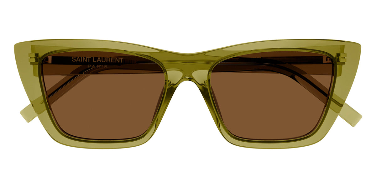 This cat eye Saint Laurent sunglass comes in a shiny olive green frame with brown with light mirror lenses.