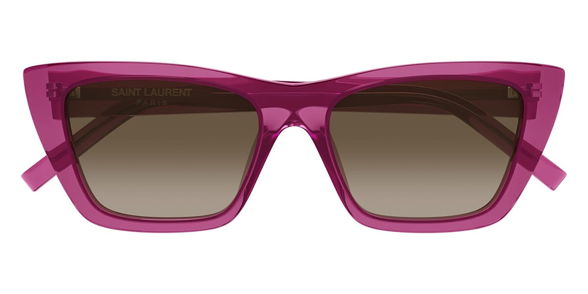 This cat eye Saint Laurent sunglass comes in a pink frame with green lenses.