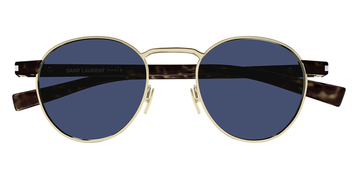 This round Saint Laurent sunglass comes in a shiny gold and havana frame with blue with light mirror lenses.