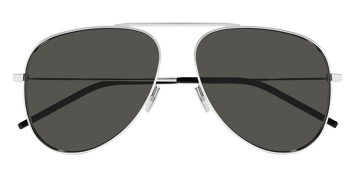 This aviator Saint Laurent sunglass comes in a shiny silver frame with grey lenses.