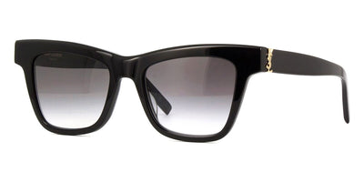 This cat eye Saint Laurent sunglass comes in a shiny black frame with grey lenses.