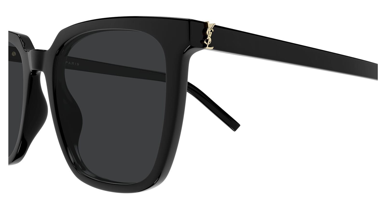 This square Saint Laurent sunglass comes in a black frame with dark grey lenses.