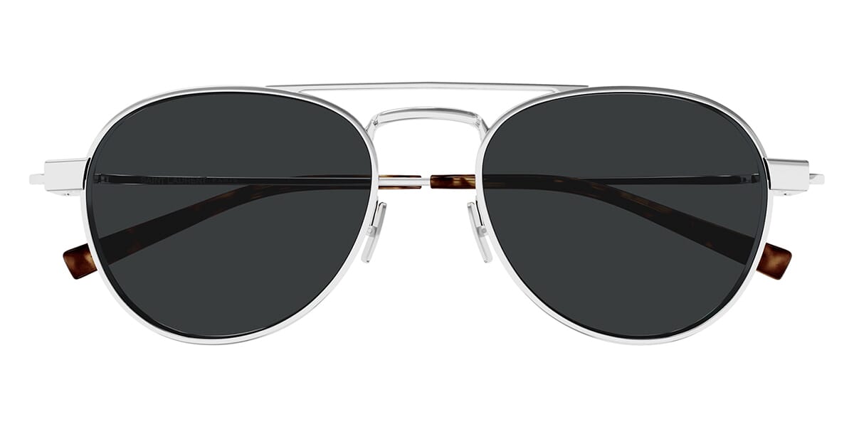 This aviator Saint Laurent sunglass comes in a shiny silver frame with grey with light mirror lenses.