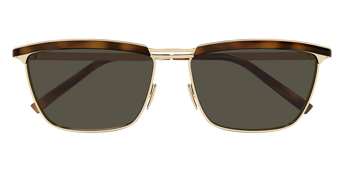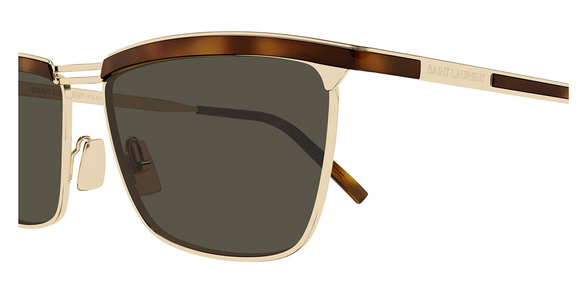 This square Saint Laurent sunglass comes in a gold with havana frame with grey lenses.