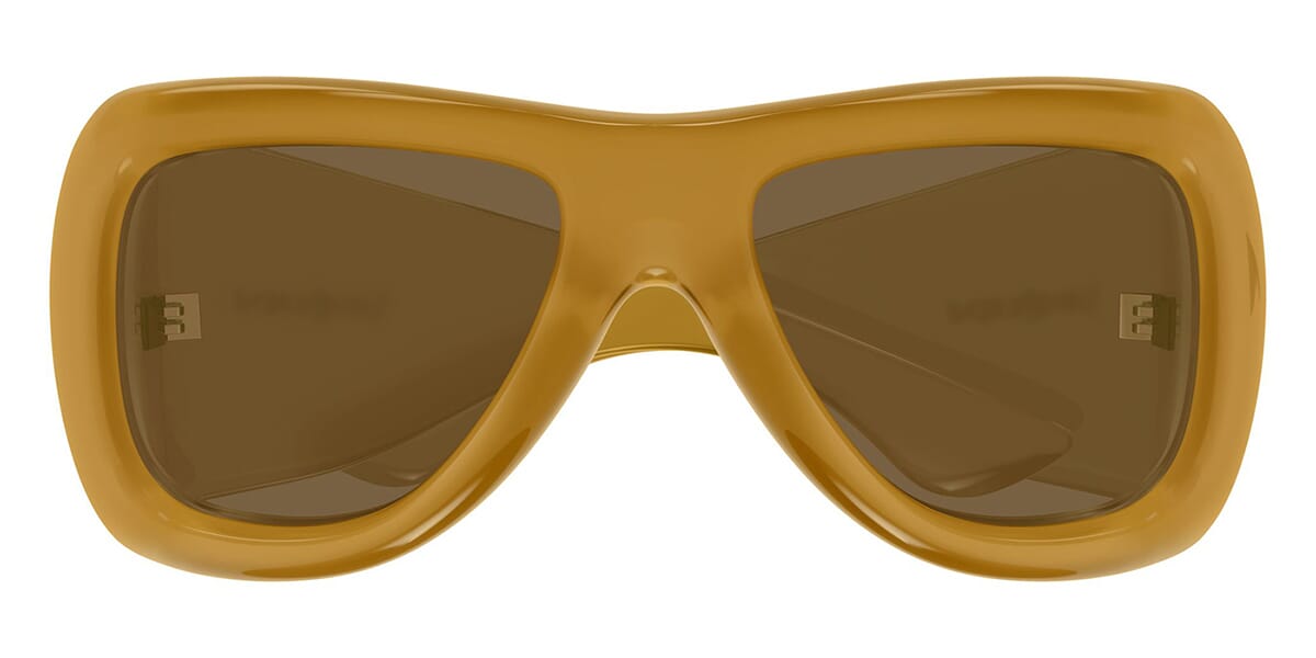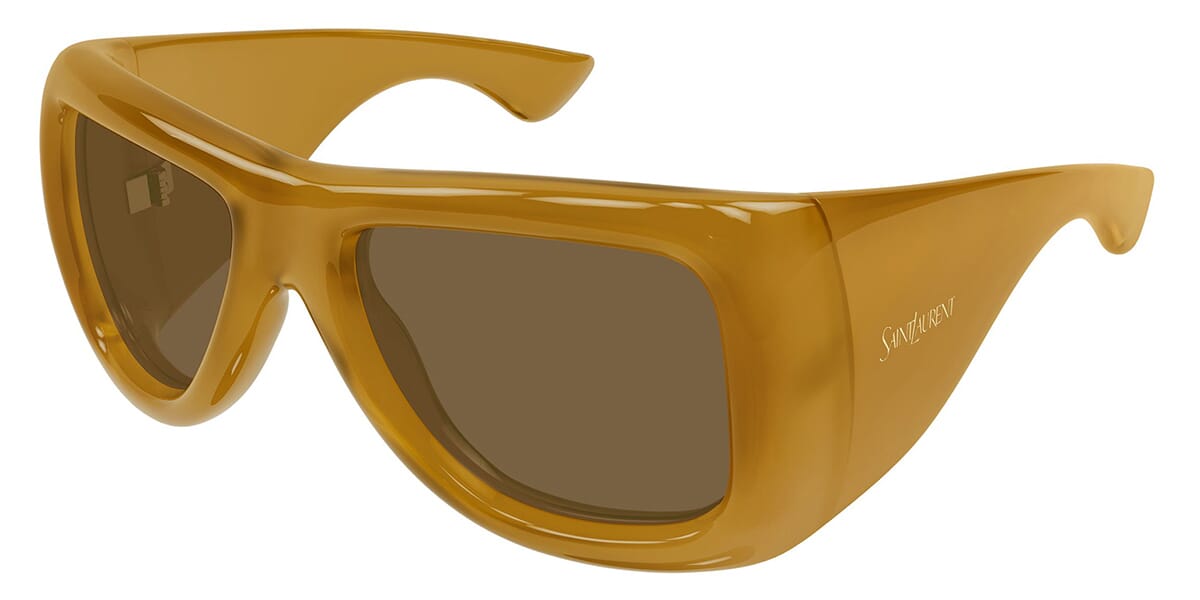 This square Saint Laurent sunglass comes in a dark mustard yellow frame with brown lenses.