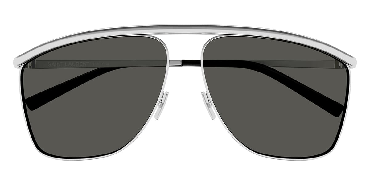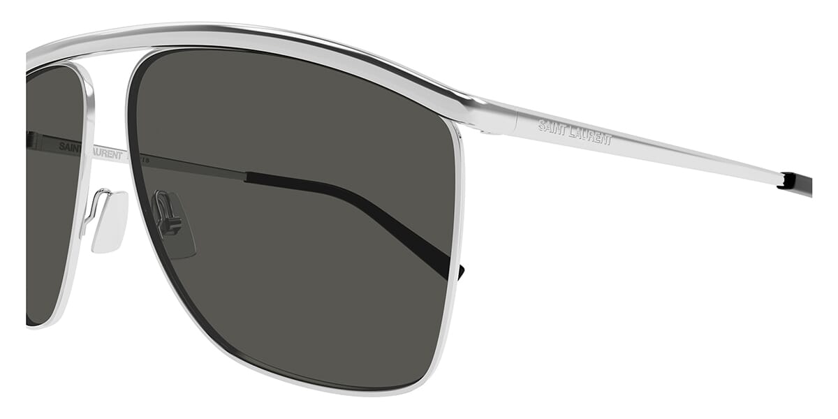 This aviator Saint Laurent sunglass comes in a shiny silver frame with grey with light mirror lenses.