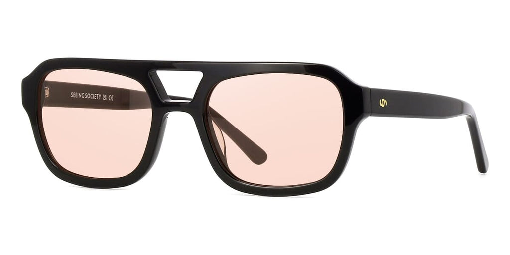 This square Seeing Society sunglass comes in a shiny black frame with light red lenses.