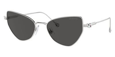 This cat eye Swarovski sunglass comes in a silver with silver and crystal detachable clip-on trim frame with grey smoke with platinum mirror lenses.