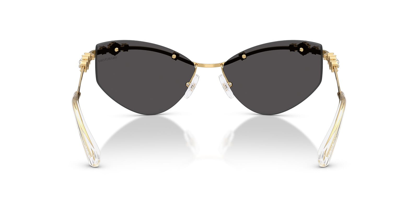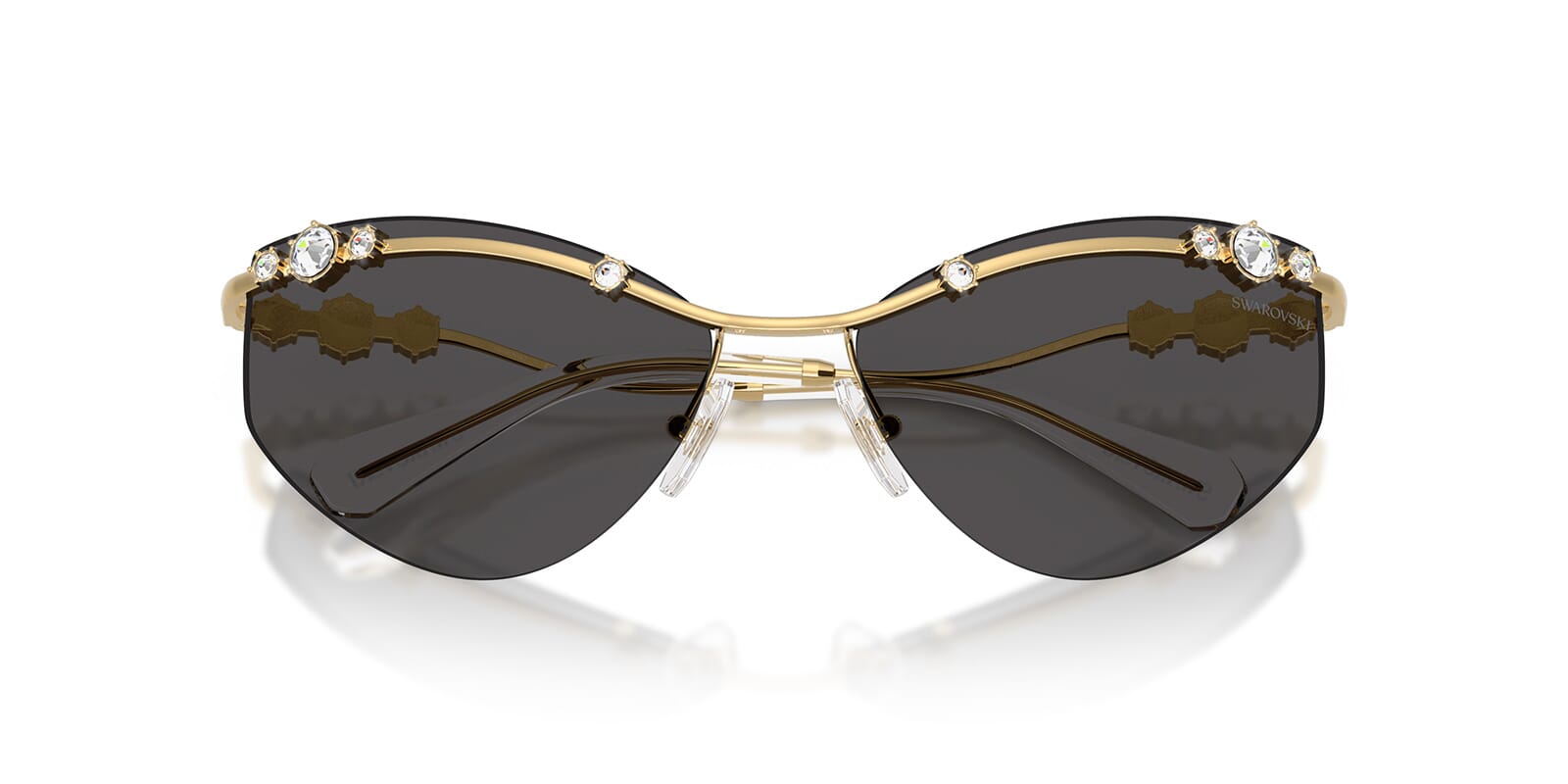 This cat eye Swarovski sunglass comes in a gold frame with dark grey lenses.