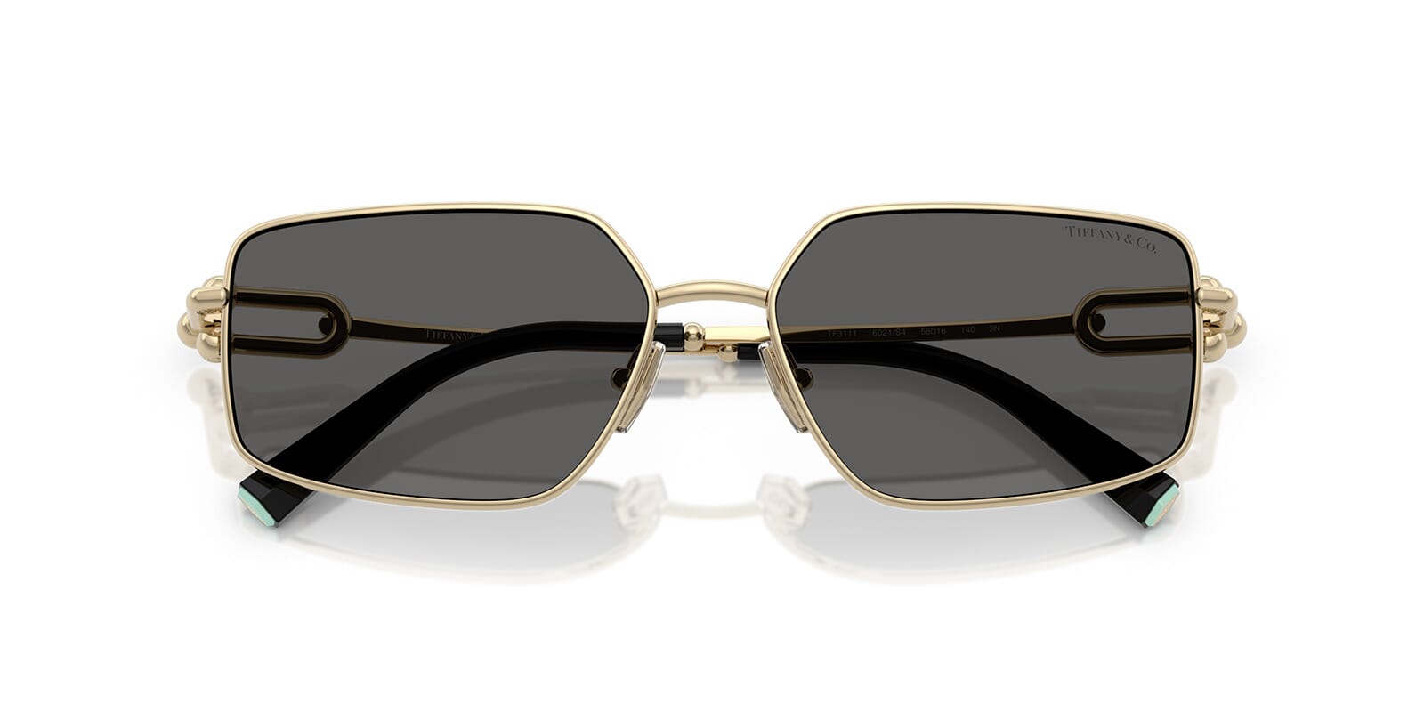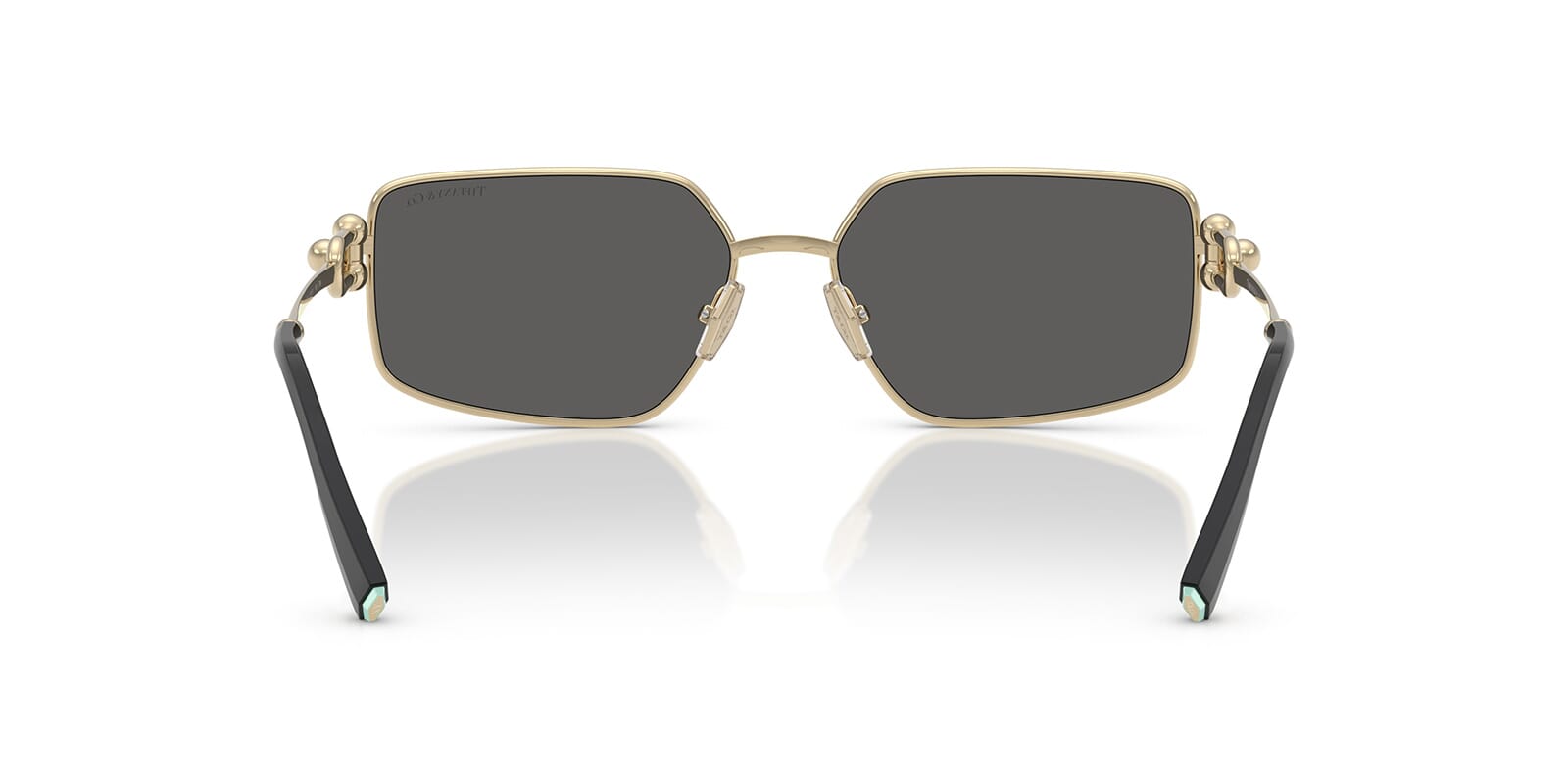 This rectangular Tiffany sunglass comes in a pale gold frame with dark grey lenses.